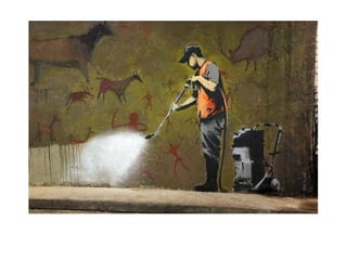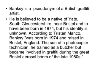 Banksy is a pseudonym for a British graffiti artist whose true identity is unknown. He was born in 1974 in Bristol, England and began doing graffiti in the late 1980s. Banksy's street art combines graffiti writing with stenciling and often features political or social commentary. While his identity is secret, his artworks have appeared in cities around the world.