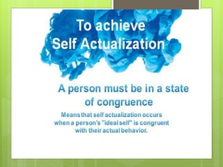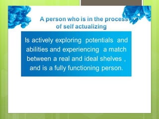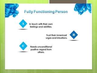 3) Key aspects of his person-centered theory include the actualization tendency which posits people strive to reach their full potential, the ideal self which is one's view of who they want to be, and congruence between the self and experiences.