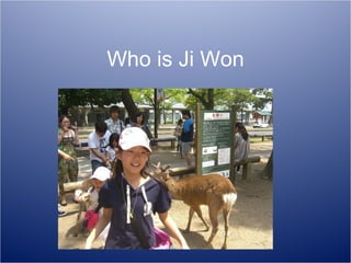 Ji Won describes her family which consists of her parents and younger sister Ji Woo. Her mother stays at home and is a good cook while her father trains people and is kind. She discusses Korean culture including traditional dress called Han Bok and the spicy food Kim Chi. Her favorite activities include playing board games with family, skiing, and visiting Universal Studios for adventures. Her dreams are to have a puppy to walk and play with and to have many mystery books to read in bed since she enjoys mystery stories.