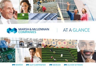 Marsh & McLennan Companies is a global professional services firm founded in 1871 with over 57,000 employees worldwide. It has four main businesses: Marsh, Guy Carpenter, Mercer, and Oliver Wyman. The company provides risk management, insurance broking, reinsurance services, management consulting, and human resource consulting to clients in over 130 countries. It has a long history of growth through acquisitions and expanding globally to become a leader in its industries.