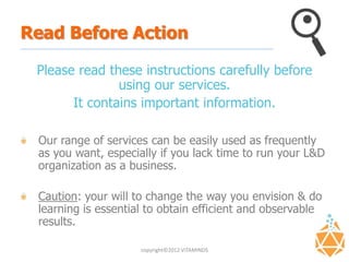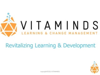 Vitaminds provides learning and development services to help organizations modernize and optimize their L&D functions. Their services can be used frequently and on-demand to save time and focus on assessing business needs. Vitaminds is recommended for organizations struggling with transforming L&D governance, selecting learning technologies, modernizing training programs, and justifying the value of learning. Their suite of services provides a one-stop-shop for all L&D needs through an energizing approach.