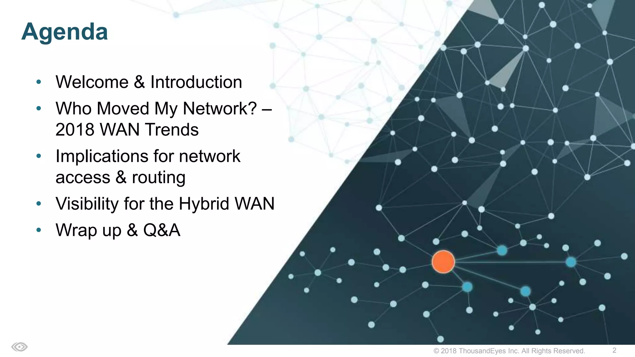 The document outlines the impact of cloud and internet technologies on modern Wide Area Networks (WAN), highlighting the shift in IT governance beyond traditional boundaries and the need for enhanced security measures. It presents ThousandEyes' network intelligence solutions, which provide comprehensive visibility into network performance for enterprise routers and enable active monitoring for both internal and external networks. Additionally, it emphasizes the importance of adapting to the evolving requirements of branch networks through virtualization and intelligent routing solutions.