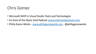 Chris Gomez is a Microsoft MVP in Visual Studio Tools and Technologies and co-host of the Static Void Podcast. To develop .NET Core applications, the prerequisites include installing .NET Core from dot.net, additional tools like Node.js, Bower, Git, and Yeoman, and optionally a virtual machine to run Linux. Projects can be created with Visual Studio 2015, dotnet new command line, or using the Yeoman generator. Resources for learning more include documentation on .NET Standard, .NET Core, ASP.NET Core, and Omnisharp for editor support.