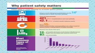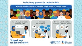 The WHO has established patient safety as a global health priority in response to the large burden of harm that occurs from unsafe healthcare worldwide. Millions of patients are injured or die each year due to errors, and many common medical practices like medication errors, healthcare-associated infections, and unsafe surgery contribute significantly to this burden. In recognition of this issue, the World Health Assembly designated September 17 as World Patient Safety Day to increase awareness and promote global action. The WHO is working to provide leadership, guidelines, and support to help countries strengthen patient safety, including initiatives to reduce healthcare-associated infections, improve surgical safety, and ensure medication is used safely.
