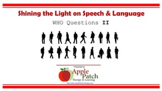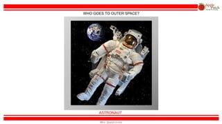 This document lists different occupations and the people associated with each one. It poses the question "Who..." and then provides an occupation such as astronaut, magician, scientist, and others. For each occupation it asks "Who does this?" intending to elicit the name of the person that holds that role. Some suggested activities are to ask if the person has seen someone in that role, discuss what they do, ask if they find the role interesting, and ask different questions other than just "Who...". The purpose is to practice sentence formulation, organization, and cohesion around the topic of different jobs and who performs them.