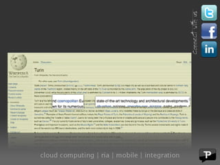 The Turin Project is a software consultancy founded in 2009 in Turin, Italy. It aims to provide innovative technology solutions for enterprises through a modern approach that combines traditional consulting with today's collaborative workspaces. Teams of specialized Turin Project Consultants work globally to deliver advanced solutions using online project management tools for transparency and efficiency. The company's goal is to keep projects simple through social project management.