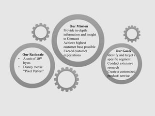 The Zettabytes aim to provide in-depth information and insight to Comcast to achieve the highest customer base possible and exceed customer expectations. They will identify and target a specific customer segment, conduct extensive research, and create a customized product or service. Their team structure includes a project manager, HR manager, and multiple paper directors and editors who will communicate openly and work inclusively.