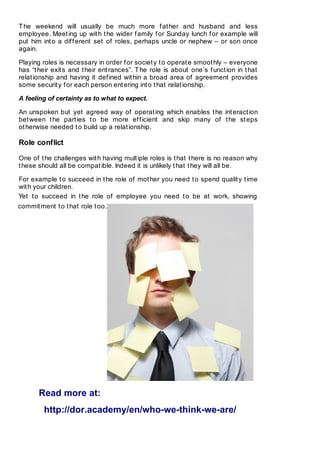 The document discusses the various roles individuals play throughout their lives and how these roles can influence identity and self-perception. It highlights the challenges of role conflict and the danger of equating one's identity with external roles, leading to feelings of loss when these roles change or disappear. Ultimately, it emphasizes the importance of finding an internal source of identity rather than relying solely on external roles to achieve a true sense of self.