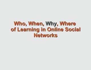 The document discusses the evolution of learning in online social networks from 1998 to 2011, highlighting the transition from scarce information to abundant and conversational contexts. It emphasizes the importance of participation in social networks, statistics on internet use, and effective filtering tools for finding relevant information and connections. Additionally, it advocates for building relationships and understanding through storytelling and collaboration in digital environments.