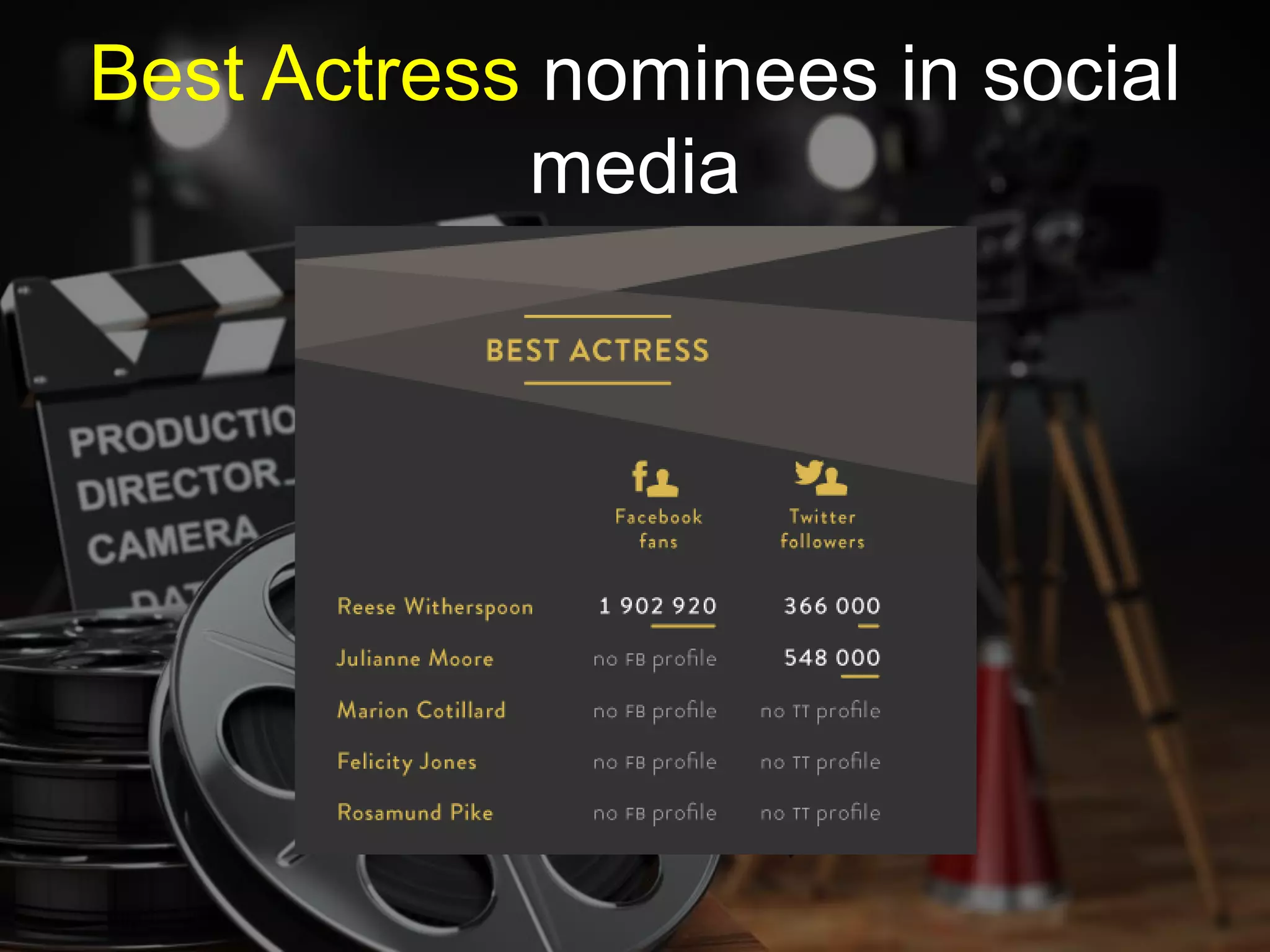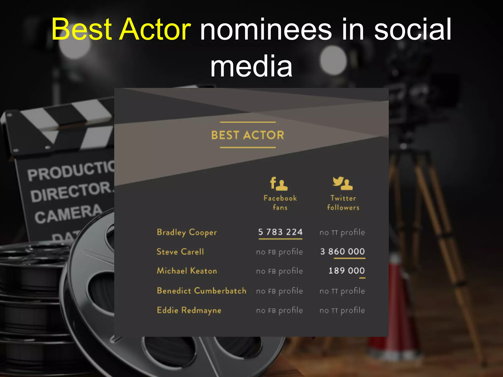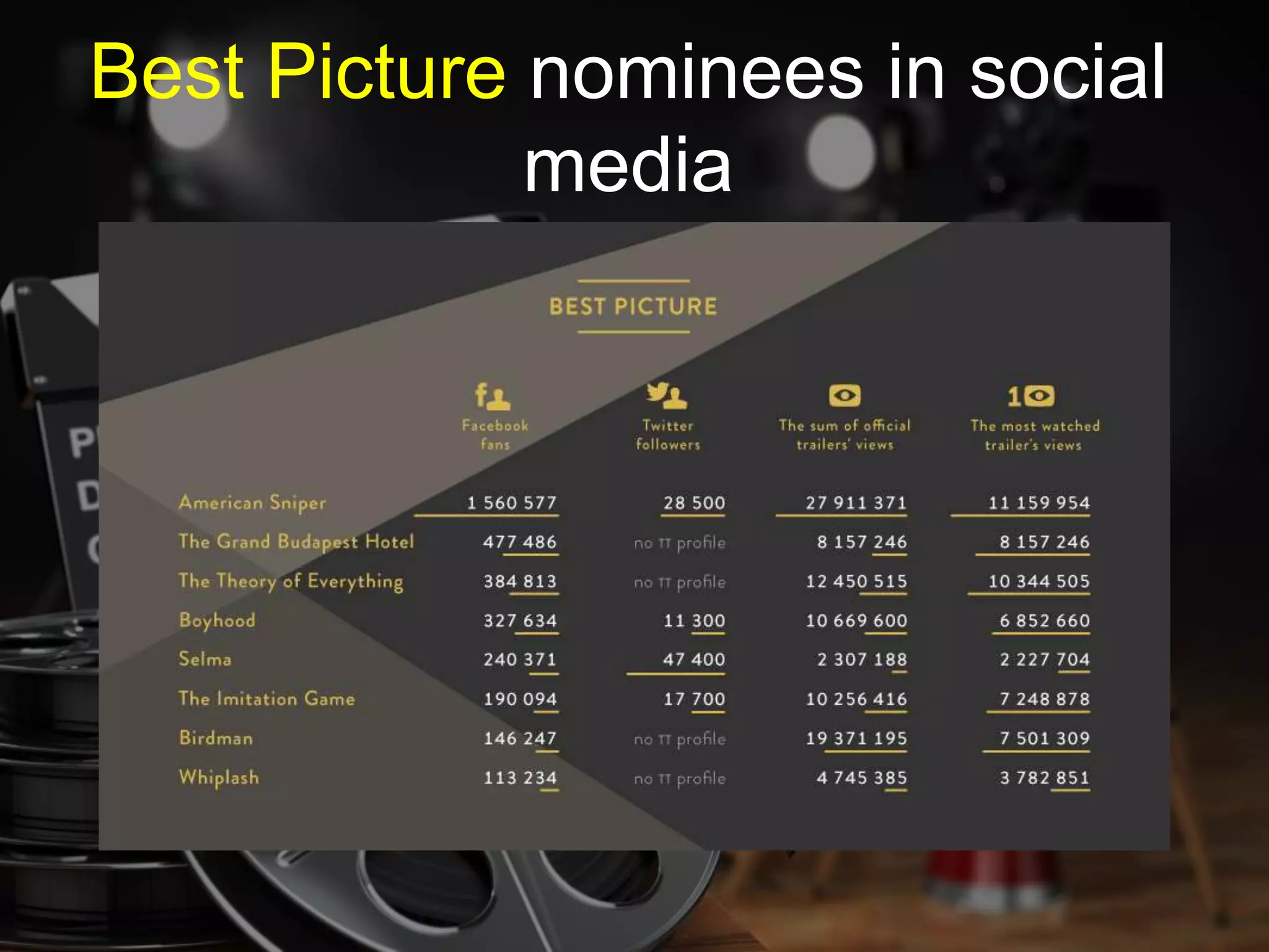 The document discusses how brands try to benefit from social media buzz around major award shows like the Oscars. It notes that while most Best Picture nominees are active on social media, many nominated actors do not have official accounts. It then shares results of a hypothetical poll of social media users' picks for the top Oscar categories, and provides statistics on the social media reach of the actual winner for Best Picture, American Sniper. The document concludes by promoting social media analytics services from Sotrender that can help brands improve their results through recommendations, reporting, analytics and workflow management.