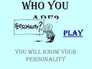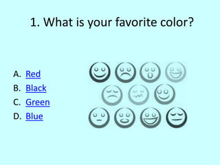 This document contains a personality quiz with questions about favorite color, singer, first date activity, food, shoes, travel destination, exercise habits, and number of friends. Based on the answers provided, it then analyzes the personality, stating that the person is happy all the time, sometimes angry, sometimes sad, and crazy. It aims to determine someone's personality type through their responses to various multiple choice questions.