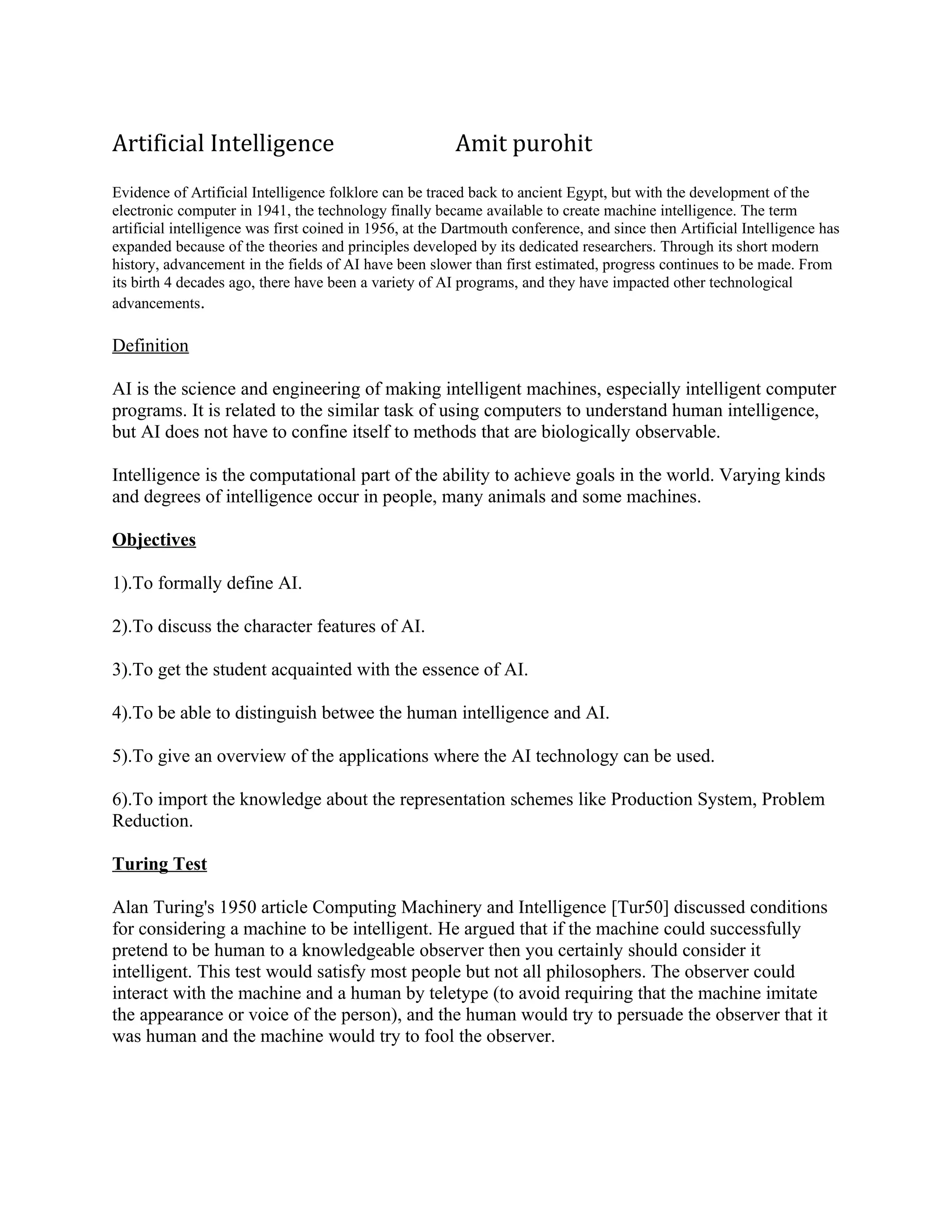 The document provides an overview of artificial intelligence (AI), including its history, definitions, objectives, and applications. Some key points:
