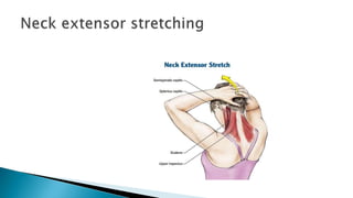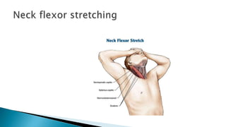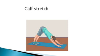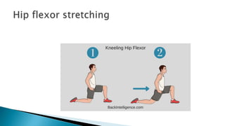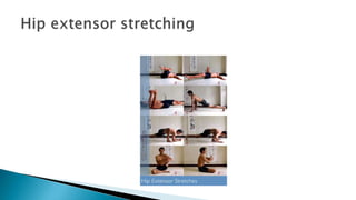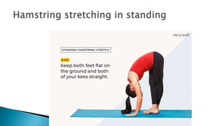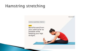 The document discusses active stretching and its benefits. Active stretching involves holding a pose for 10-30 seconds using only the muscles targeted by that pose. Each muscle group should be stretched 3-5 times. Benefits of active stretching include less tightness, better circulation, increased flexibility, pain relief, improved performance, and decreased chances of soft tissue injury. Active stretches can be static, dynamic, or ballistic.