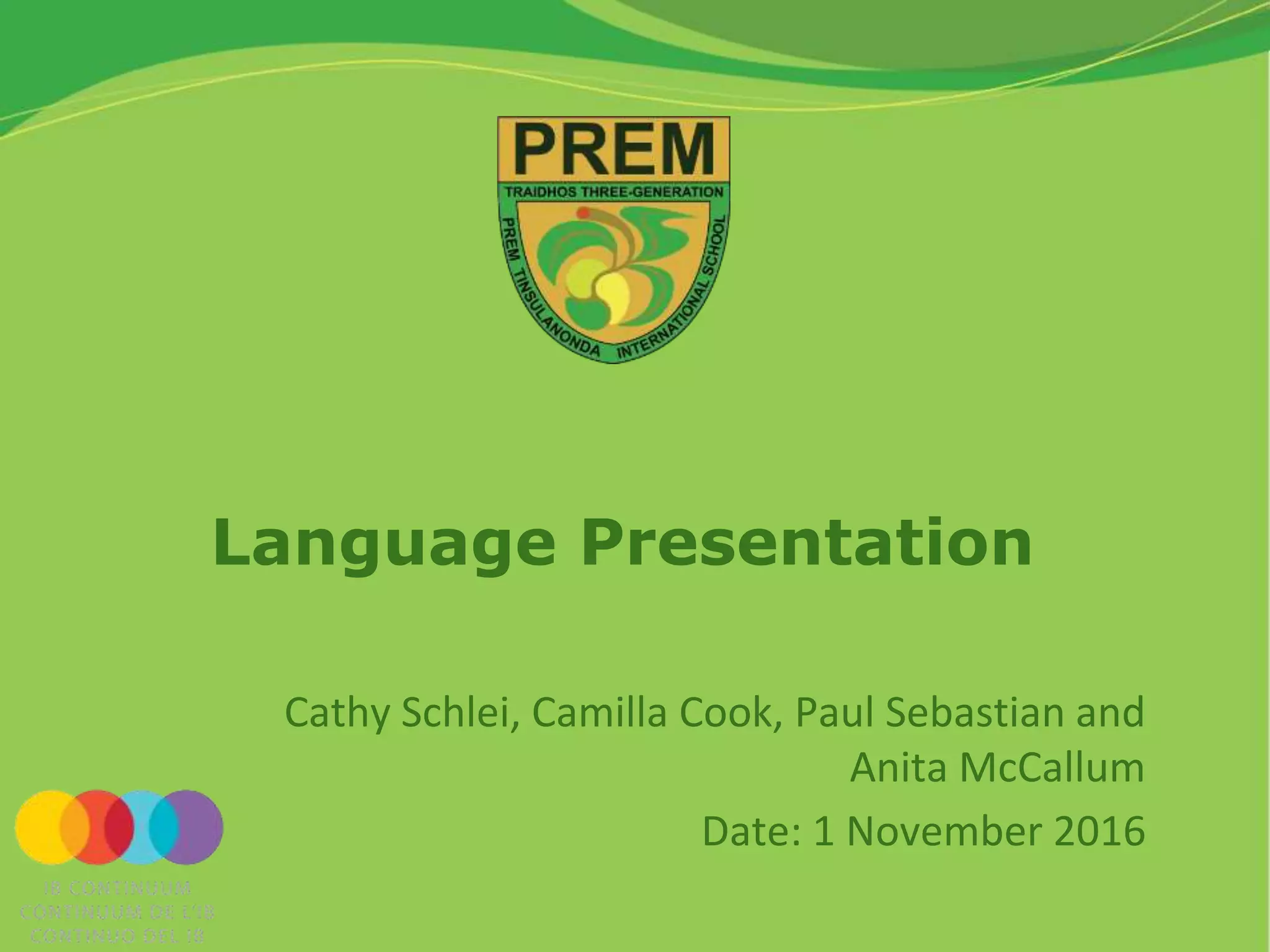 The presentation covered Prem's whole school language policy and pathways. It discussed the importance of English as the language of instruction, supporting students' mother tongue development, and ensuring literacy in at least one language. The pathways were exemplified by three students with different language experiences - one studying in their mother tongue of English, one studying their mother tongue of Thai, and one studying both their mother tongues of English and Korean. The key points were that every child's experience is unique and the most important factor is strong literacy, with both language and literature and acquisition courses being valued diploma options.