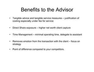 This document summarizes the benefits of direct systematic investing for advisors, businesses, and clients. For advisors, it provides justification for fees, allows a focus on strategy over transactions, and offers a point of differentiation. For businesses, it enables scalable boutique advice, the ability to capture higher net worth clients, and a value-add service. For clients, it provides clear fees and services, transparency of investment outcomes, and a differentiated approach. The strategy attributes include no forecasting, adaptive momentum triggers, cash protection in downturns, and the ability to operate on any market.