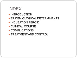 Pertussis, or whooping cough, is a highly contagious respiratory disease caused by the bacterium Bordetella pertussis. It is characterized by severe coughing fits that can end in a "whooping" sound when breathing in. The disease occurs in three stages - catarrhal, paroxysmal, and convalescent. It is most common and severe in infants under 6 months old. Treatment involves antibiotics and isolation. The disease is controlled through active immunization programs using DPT or DTaP vaccines, as well as prophylactic antibiotics for contacts of cases.