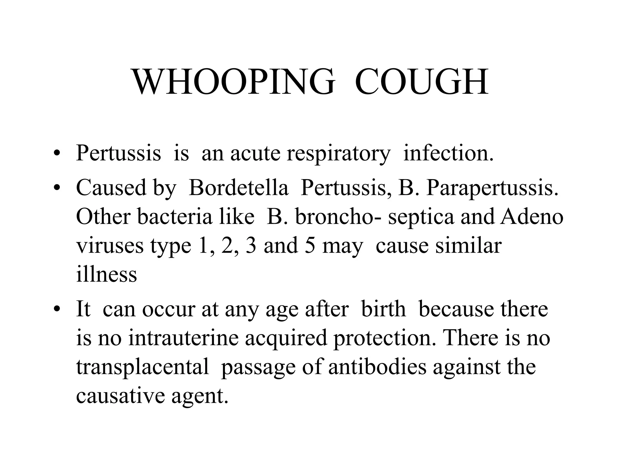 - Pertussis (whooping cough) is caused by the bacteria Bordetella pertussis and is highly contagious, spreading through respiratory droplets. It causes severe coughing fits that can last for months.
