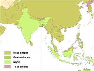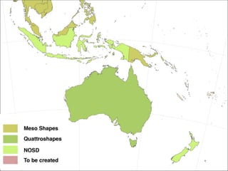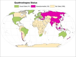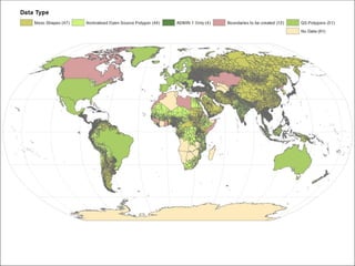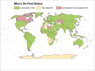 The document discusses the Who's On First project, which focuses on administrative boundaries and localities in mapping. It highlights various resources, including websites and contributors involved in open data efforts, while also critiquing the quality of such data. The project aims to improve access and understanding of geographic information.