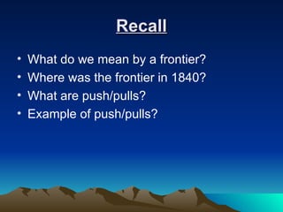 The document discusses the motives and groups of people who settled the American West in the 1840s. It focuses on explaining the roles of mountain men in pioneering the frontier. Mountain men were early explorers and fur traders who helped open up the West and played an important role in the settlement of the region. Their daily lives were difficult but they blazed trails and traded with Native Americans, influencing the development of the West.