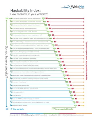 This document is a checklist that assesses how hackable a website may be. It asks a series of yes or no questions about the website's security practices, such as whether it uses HTTPS, implements content security policies, protects against brute force attacks, and sanitizes user input. Based on the answers, it determines whether the site is likely safe, probably safe, or hackable. The goal is to help website owners evaluate their security posture.