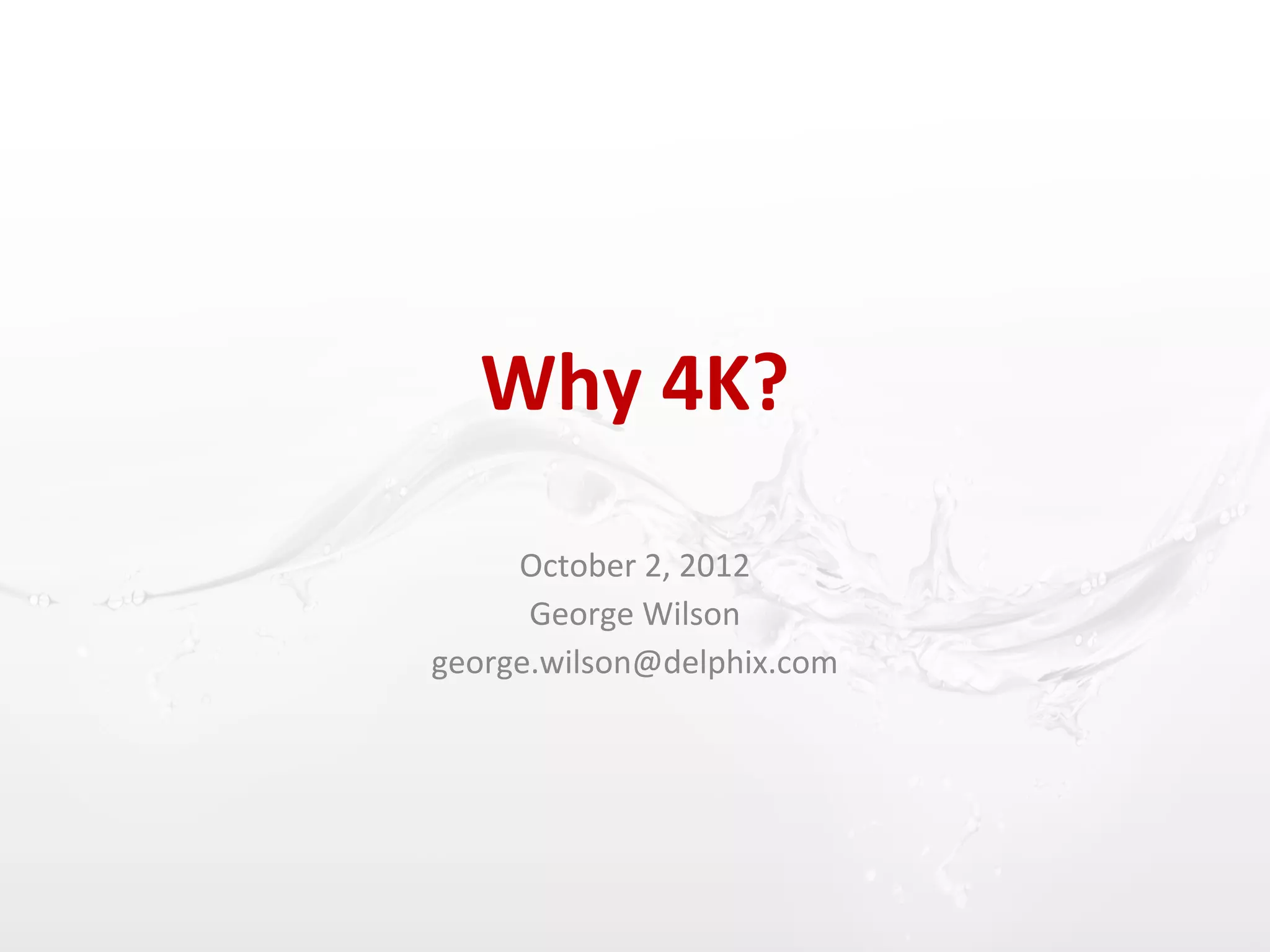 This document discusses the transition from 512-byte disk sectors to 4K sectors, known as Advanced Format. It describes how Advanced Format 512e drives emulate 512-byte sectors with 4K physical blocks, which can reduce performance and cause issues with misaligned and sub-block reads/writes. Solutions exist to override the reported sector size, but moving to a 4K-aligned filesystem like ZFS also introduces drawbacks such as reduced compression ratios and metadata inefficiency. The document raises questions about how various operating systems will handle a 4K-based root pool configuration.