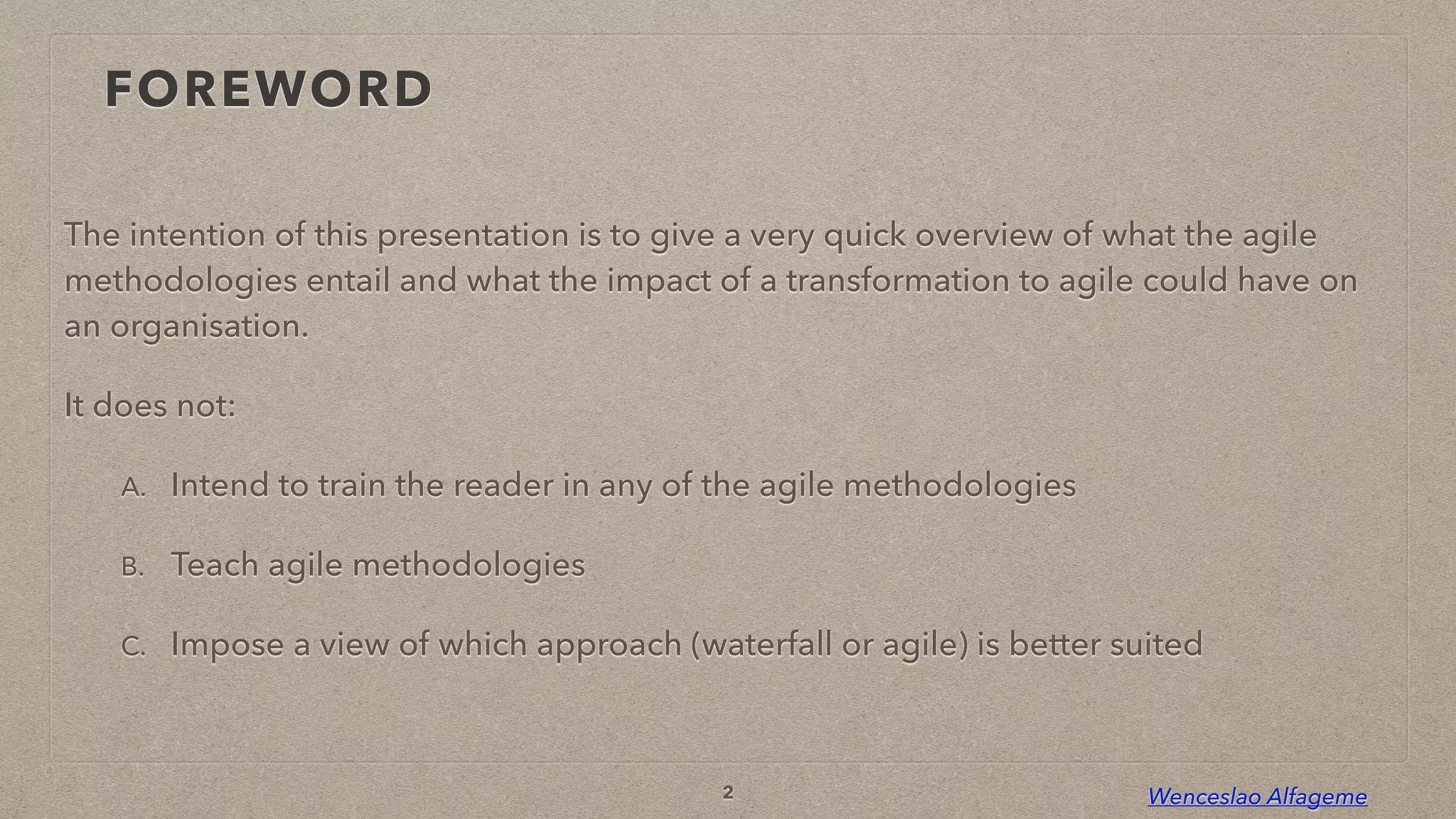 The document provides an overview of agile methodologies, including their benefits and disadvantages. Some key points: