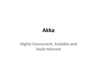 Akka is an open source toolkit for building highly concurrent, distributed, and fault-tolerant applications on the JVM. It uses the actor model and software transactional memory to provide a higher level of abstraction for writing scalable applications compared to lower-level concurrency primitives. Akka embraces the "let it crash" model of fault tolerance used in telecom to build self-healing systems and aims to make building reliable distributed systems easier.