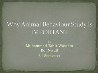 This document discusses the field of animal behavior and its importance and applications. It notes that animal behavior is the study of how animals interact with each other and their environment, and serves as a bridge between physiology and the environment. It then outlines several ways in which the study of animal behavior contributes to and influences other fields, such as neuroscience, environmental management, human behavior studies, and conservation. Specific examples are given of insights gained into areas like communication, emotional expression, migration patterns, and pest control from animal behavior research. The document also discusses how animal behavior courses can increase scientific literacy and interest in biology.