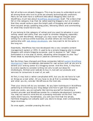 Not all writersare already bloggers. This may be easy to understand as not all among those who love to write are already technologically proficient. Many do not even have a sufficient idea about blogging sites such as WordPress, much less about WordPress development itself. The writers that fall on this category may then be called aspiring bloggers, but on condition that they would venture upon the bright path of blogging and what awaits them beyond simply updating blog posts, following others and commenting on what they would have to say. If you belong to this category of writers and you want to advance in your writing career and skills, then you ought to consider blogging, especially blogging with WordPress. Although you may never have thought about writing for a serious online business, as what others are now doing in partnership with web design developers, you may want to do the same in the long run. Essentially, WordPress has now developed into a very versatile content management system or CMS. It used to be a simple blogging site to simple bloggers with simple blogging purposes—just to express or “sell” ideas formulated in a nice play of words, attracting other bloggers to also “buy” those ideas by expressing likes or positive comments in return. But the times have changed and those companies behind custom WordPress development have increasingly demanded for real writers such as you are to extend your writing career to a blogging career. And this time, it may have to evolve rapidly to consider writing not only to sell out ideas for intellectuals, thinkers and radicals to buy in, but sell out products and services for consumers to avail of, as well. At first, it may look a rather complicated shift, but you do not have to rush on things as a real writer. All you have to do at first is consider blogging, and when you do, consider WordPress as the host site. Then your choice will do you wonders. As you learn techniques in WordPress pertaining to enhancing your blog design and how to get more people to read your posts, you are actually like training yourself on becoming a content provider and WordPress poster for a website development company. You may not want to mind this as a pressing motivator at the first. You really didn’t have to. Nonetheless, you will soon find that the simple, harmless blogging can actually open you doors to large, even unexpectedly large revenues. So once again, consider pressing the word.