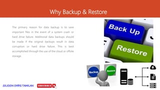The document discusses the importance of data backup and the various types of backups: full, incremental, and differential. Full backups create copies of all designated files, incremental backups only save new or changed files since the last backup, and differential backups capture changes since the last full backup. The document also includes personal information about the author, Vignesh Kumar, and links to his social media and YouTube channel.