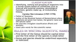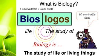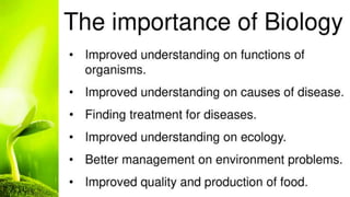 The document outlines the history of biology and its subdivisions, noting key figures such as Aristotle, who is considered the father of biology and zoology, and Theophrastus, known as the father of botany. It details the contributions of Theophrastus to botany, including his comprehensive studies of plants and agriculture. Additionally, the document mentions microbiology and Leeuwenhoek as its father, alongside an extensive list of biological fields and disciplines.