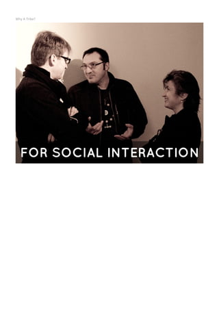This document discusses why tribes are important. It suggests that tribes fulfill deep human needs for belonging, purpose, and meaning through shared beliefs and mutual support. Tribes allow people to connect over common interests and help each other succeed.