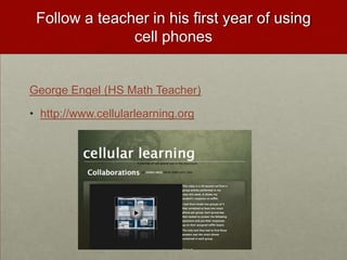 This document summarizes interviews with 16 teachers from across the U.S. who are using student cell phones in their classrooms. Most teachers reported that discipline problems decreased rather than increased. Student engagement and motivation improved on lessons and activities using cell phones. Parents were generally supportive. Alternative options were available for students without phones. Teachers found ways to work within different school cell phone policies. Many used cell phones to improve communication with students outside of class.