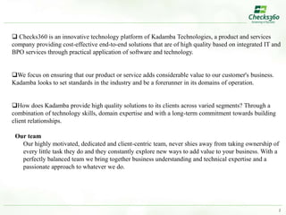 Kadamba Technologies provides cost-effective, high-quality background screening solutions through a combination of technology skills, domain expertise, and long-term client relationships. Their Checks360 platform features SmartFetch, which automatically updates case data and documents from a client's applicant tracking system into Checks360 to significantly reduce operational costs and errors. Checks360 also offers FlexiReport, which allows users to customize report templates, formats, and layouts.