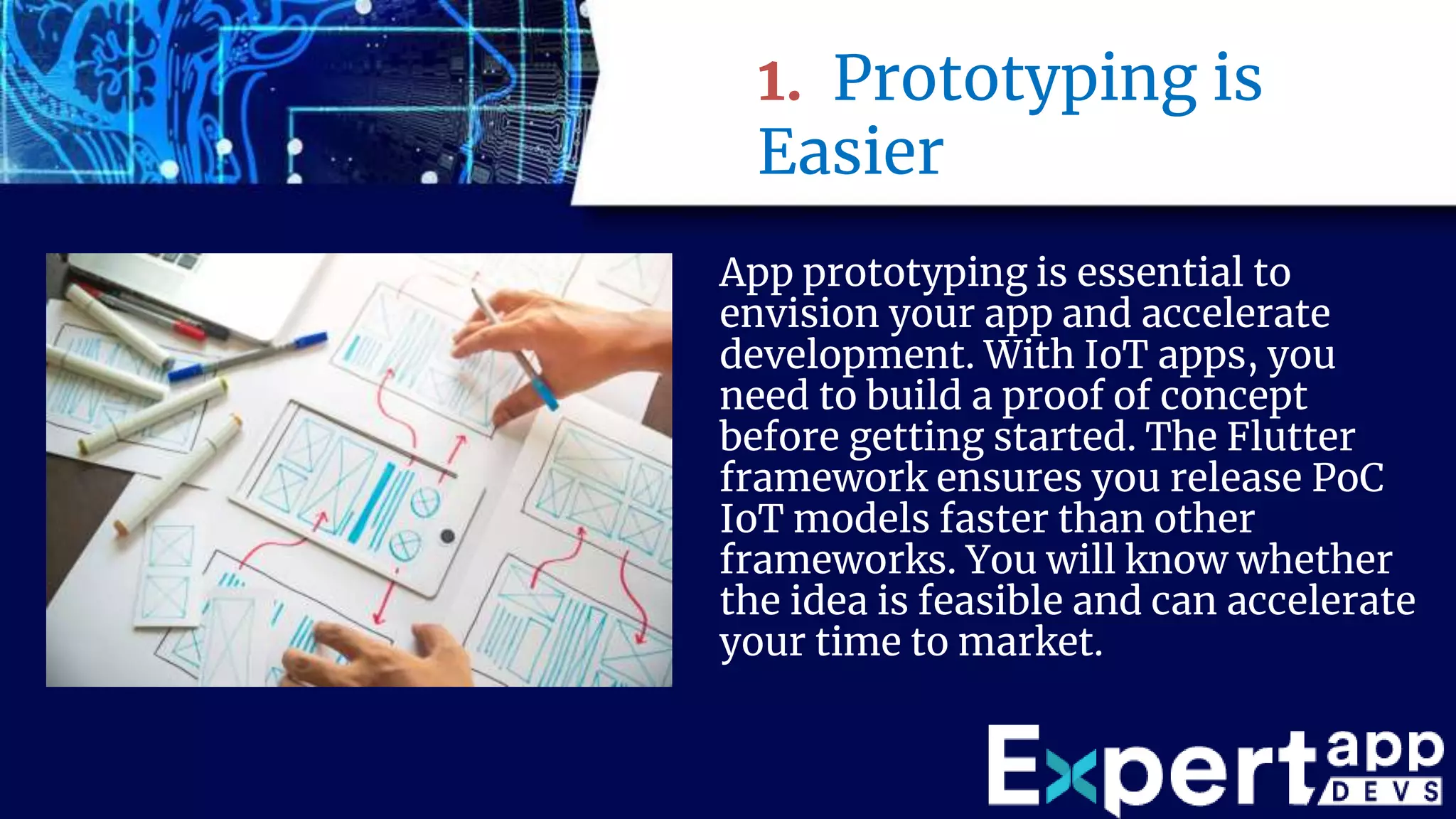 The document outlines the benefits of using Flutter for developing Internet of Things (IoT) applications, including easier prototyping, multi-platform solutions, and high performance. It emphasizes the framework's ability to create native-like apps, enable seamless deployment across platforms, and reduce development costs by allowing the use of a single codebase. Additionally, it mentions the role of gamification in user engagement and the consistent experience provided across devices.