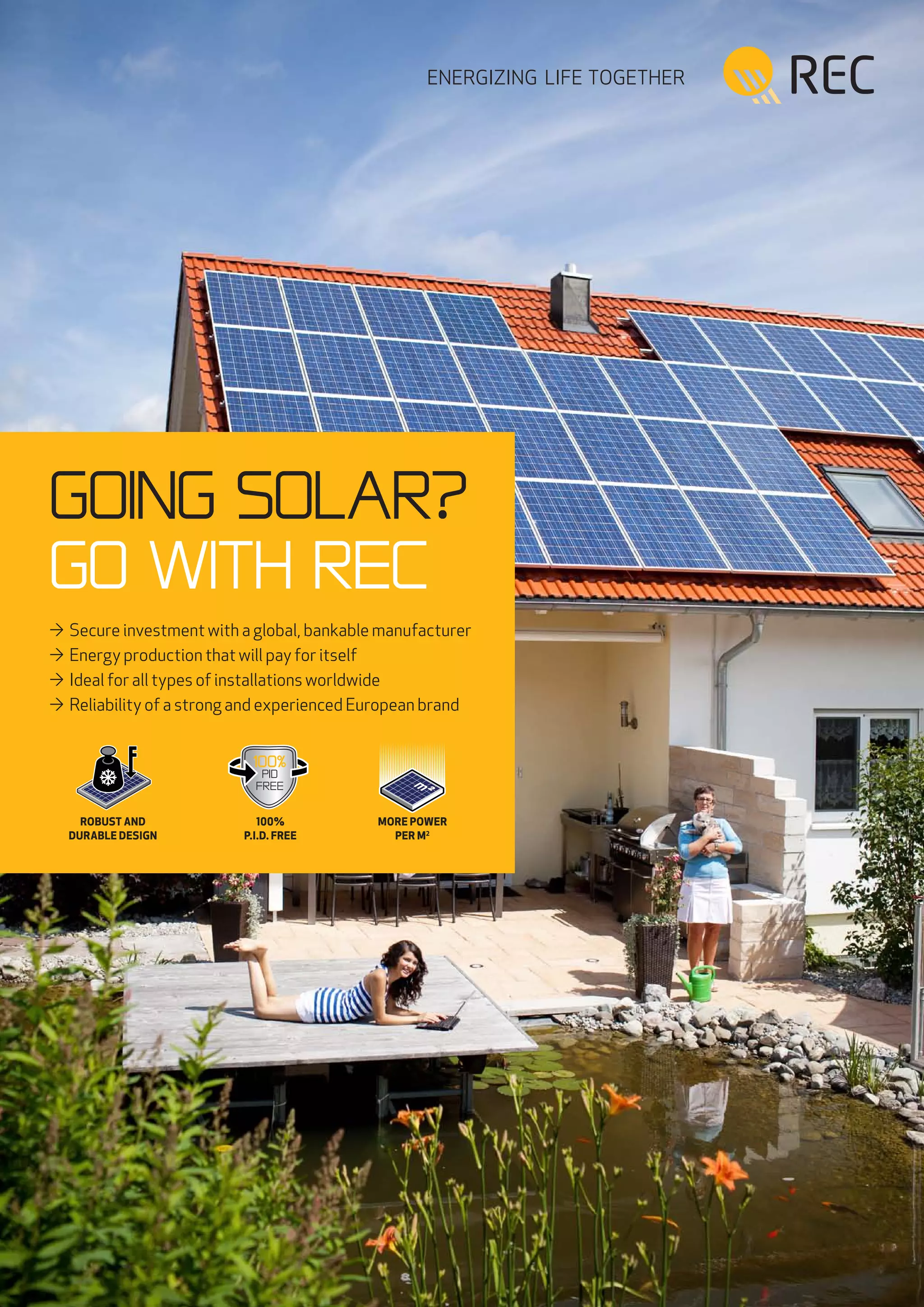 This document summarizes the key advantages of REC solar panels, which is a leading European solar panel brand. It highlights REC's reliability as a global, bankable manufacturer with over 20 years of experience. It also emphasizes the high quality and durability of REC panels, which are backed by strong linear power output and product warranties. REC panels are said to be ideal for various installations worldwide and provide a secure investment that will pay for itself through energy production.