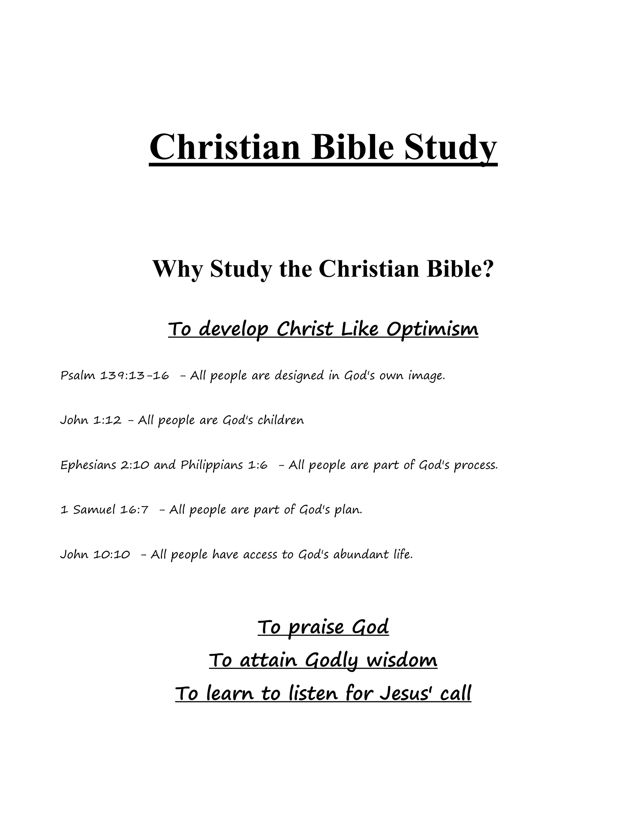 The document provides an outline for reading the Christian Bible in one year. It includes a one-page tracker with the books of the Old and New Testaments listed month-by-month. The instructions explain how to use the tracker by placing checkmarks or initials in the appropriate boxes when reading or applying passages. The purpose of regularly studying the Bible this way is to develop Christ-like optimism by finding strength, wisdom, and discerning God's call, as supported by several Bible verses included at the start.