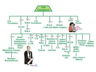 This document discusses career options for commerce students. It begins by outlining the benefits of pursuing a Bachelor of Commerce (B.Com) degree, such as gaining skills in accounting, finance, marketing, and business management. A B.Com provides a broad foundation and equips graduates with skills valued by employers. After completing a B.Com, students can pursue jobs in sectors like banking, industries, and education, or further education like MBA, CA, CS, and other professional courses. In conclusion, the document emphasizes that B.Com graduates have many career opportunities available and a B.Com is a reliable option that leads to diverse paths.
