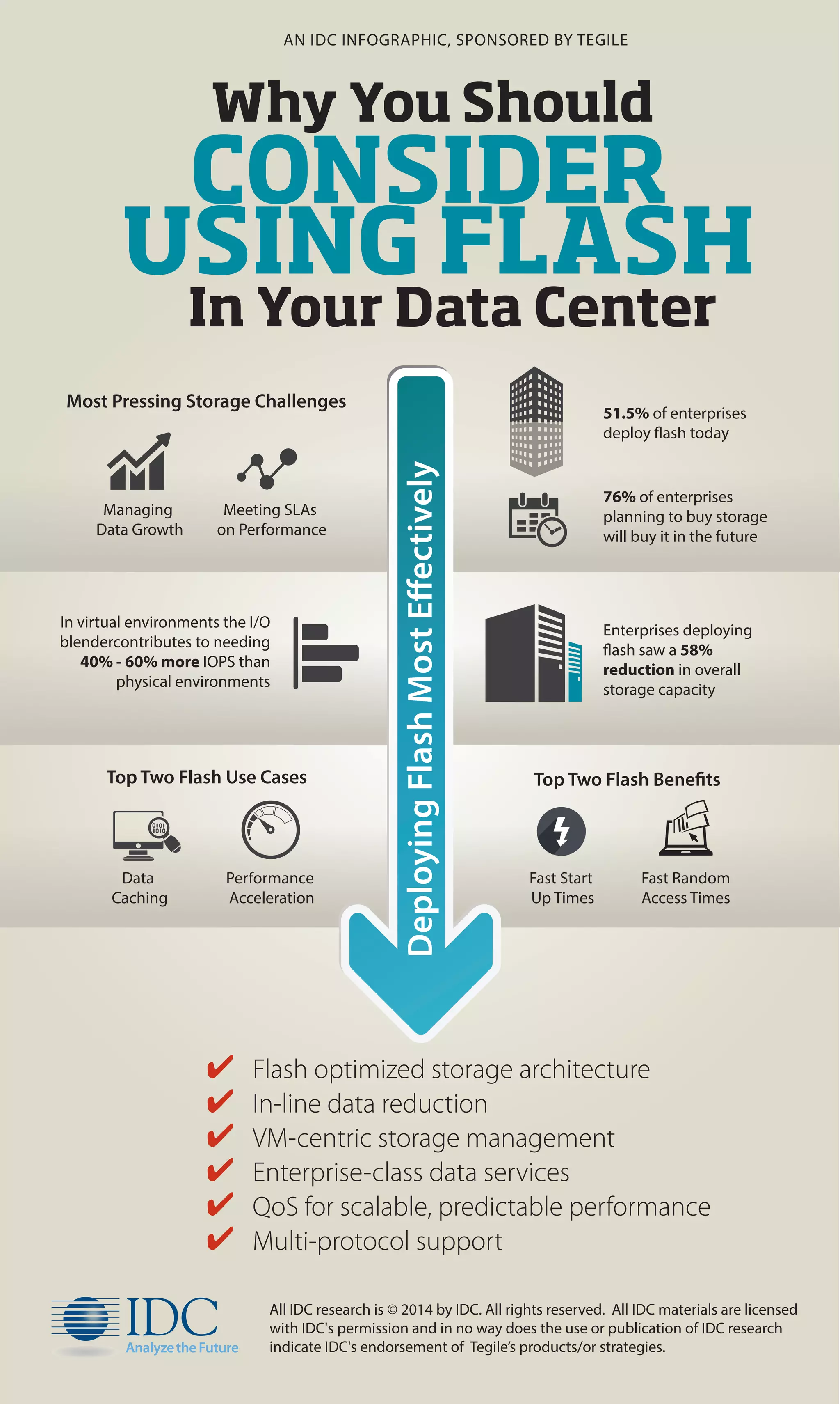 The document is an IDC infographic highlighting the benefits and features of Tegile’s flash optimized storage architecture, which includes in-line data reduction, VM-centric management, and enterprise-class data services. It notes that enterprises deploying flash can see a 58% reduction in overall storage capacity while addressing key challenges such as data growth and performance SLAs. Additionally, a majority of enterprises (76%) plan to purchase storage in the future, with over half currently using flash technology.
