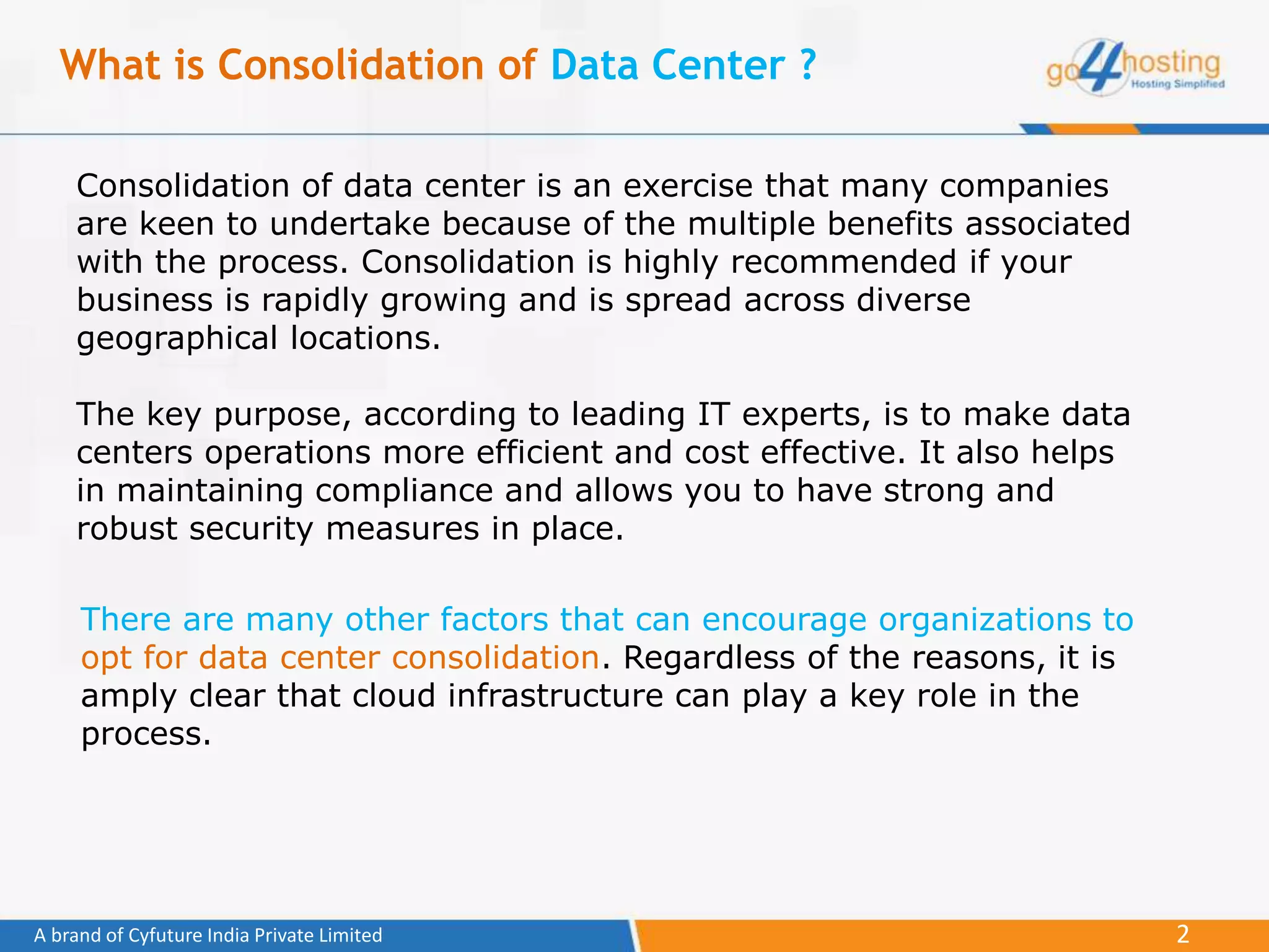 Data center consolidation is advisable for rapidly growing businesses as it enhances operational efficiency and cost-effectiveness while improving security and compliance. The challenges associated with data growth make this consolidation beneficial for managing server load and disaster recovery. Utilizing cloud infrastructure can significantly facilitate the consolidation process.