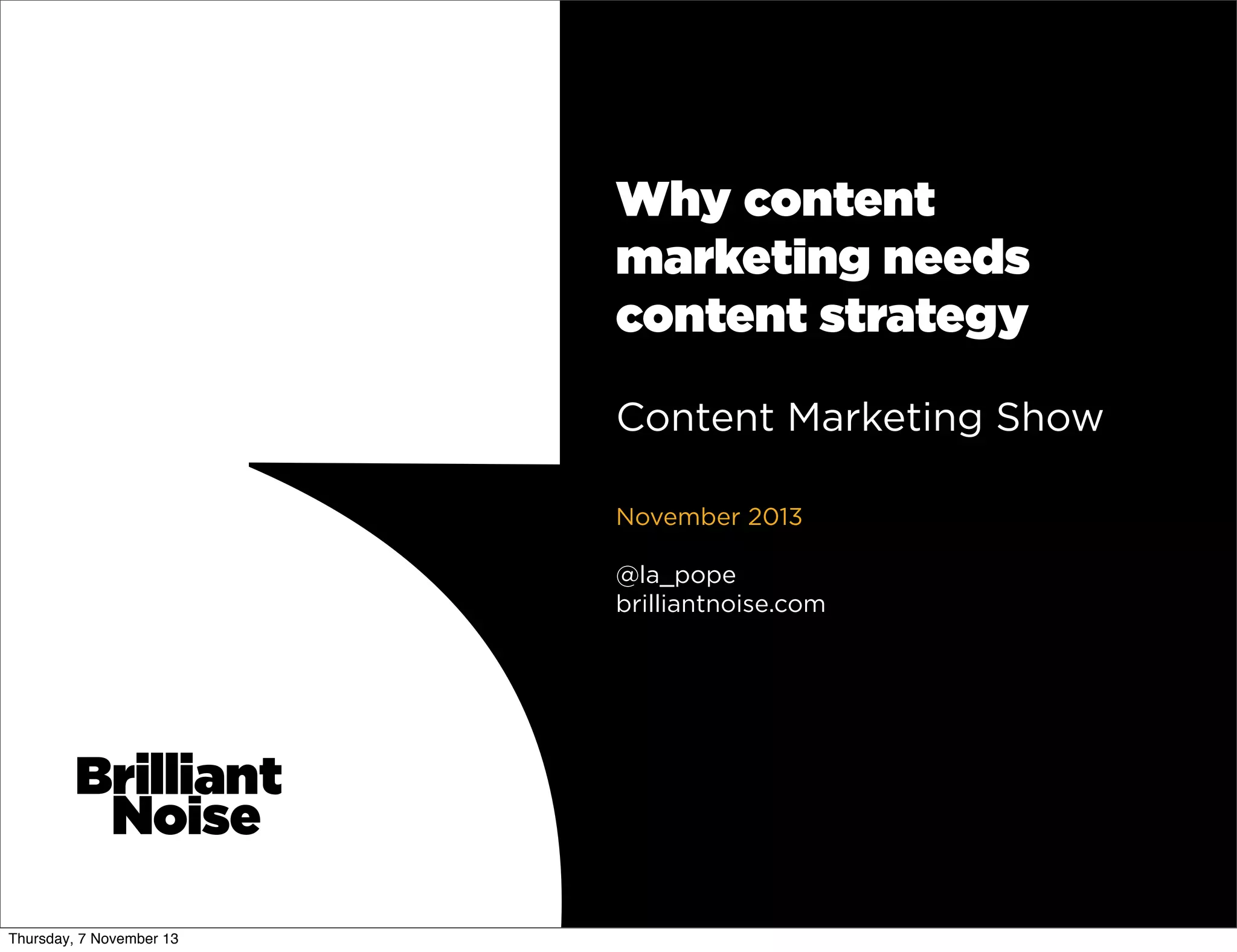 The document discusses the differences between content strategy and content marketing. Content strategy is about planning for content creation, publication and governance by focusing on the user, big picture, and governance. Content marketing is about specific tactics and campaigns by focusing on the business. The document then outlines the key elements of content strategy - purpose, people, processes, platforms, principles, and performance - and provides examples for each element. It argues that content strategy is needed to plan effective content marketing over the long-term.