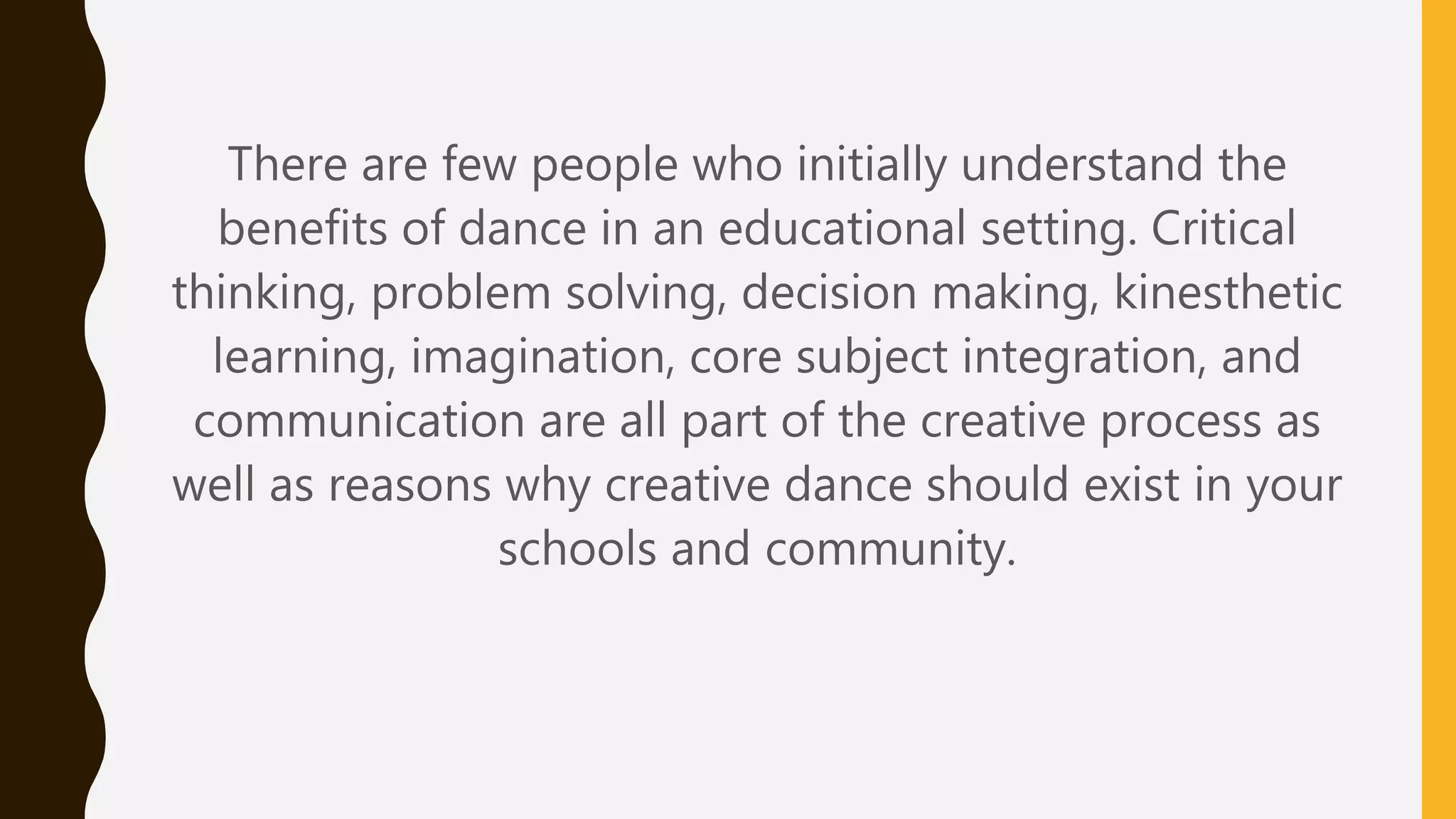 The document discusses the benefits of creative dance in education. It argues that creative dance allows students to increase their strength, agility, and coordination while also fostering creativity. Through creative dance, students are encouraged to create their own choreographies rather than just learn set dances. This open-ended creativity carries over to other subjects as well. The creative process involved in dance helps to facilitate learning in other core subjects through memorization, kinesthetic learning, problem solving, and imagination. Working collaboratively in dance builds communication, teamwork, and self-confidence in students.