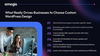 Custom WordPress website design matters more than pre-built themes because it provides complete flexibility, unique branding, and tailored functionality. Unlike generic themes, choosing a professional custom WordPress website design service easily align with specific business needs, deliver better user experiences, and adapt easily as your business grows without design limitations.