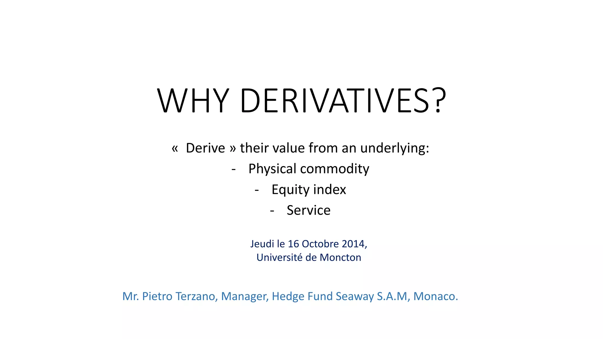 Derivatives derive their value from underlying assets such as physical commodities, equity indexes, or services. There are two main families of derivatives: options and futures/swaps/forwards. Futures are standardized, cleared, and regulated contracts where counterparties exchange the future value of an underlying at a given time. Forwards and swaps are similar to futures but are not standardized and are mostly traded over-the-counter. Derivatives are used for hedging risk, arbitrage, and speculation. Shipping companies use derivatives like forward freight agreements to hedge risks from short positions in freight markets.