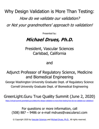 This document summarizes a presentation titled "Why Design Validation is More Than Testing: How do we validate our validation?" given by Michael Drues, Ph.D. The presentation discusses how design validation involves more than just testing, and how companies can validate their validation strategies. It addresses questions like how to validate validation approaches, defend validations to regulatory agencies, and consider validation holistically rather than just required elements. The goal is to help attendees avoid costly validation mistakes and leverage validation strategically.