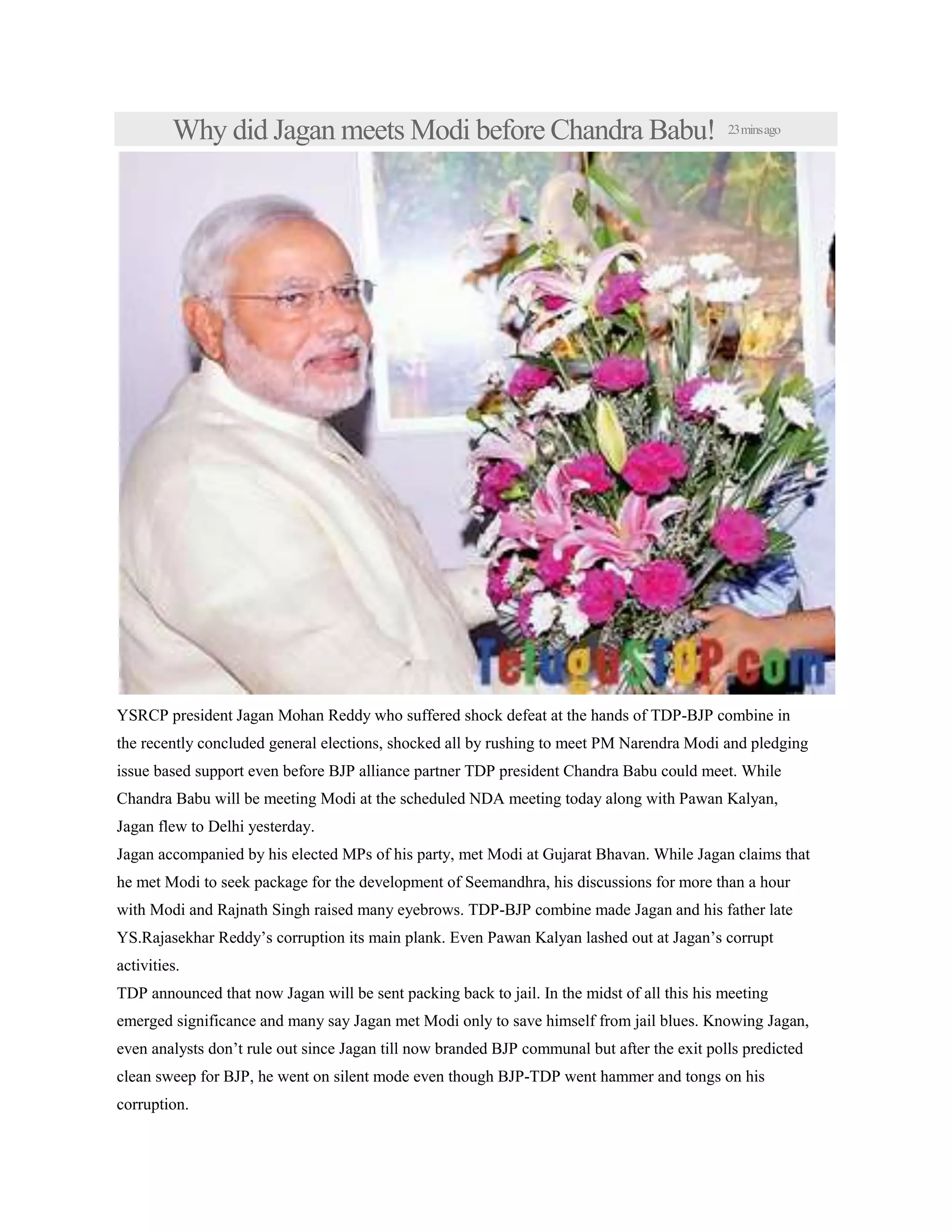 YSR Congress Party president Jagan Mohan Reddy met with Prime Minister Narendra Modi before the scheduled meeting of TDP president Chandra Babu Naidu, following his defeat in the general elections. Jagan's meeting raised suspicions among analysts, suggesting he sought support for his party's development needs while facing allegations of corruption. The timing of his meeting, ahead of Naidu's, fueled speculation that it was a strategic move to avoid legal troubles.