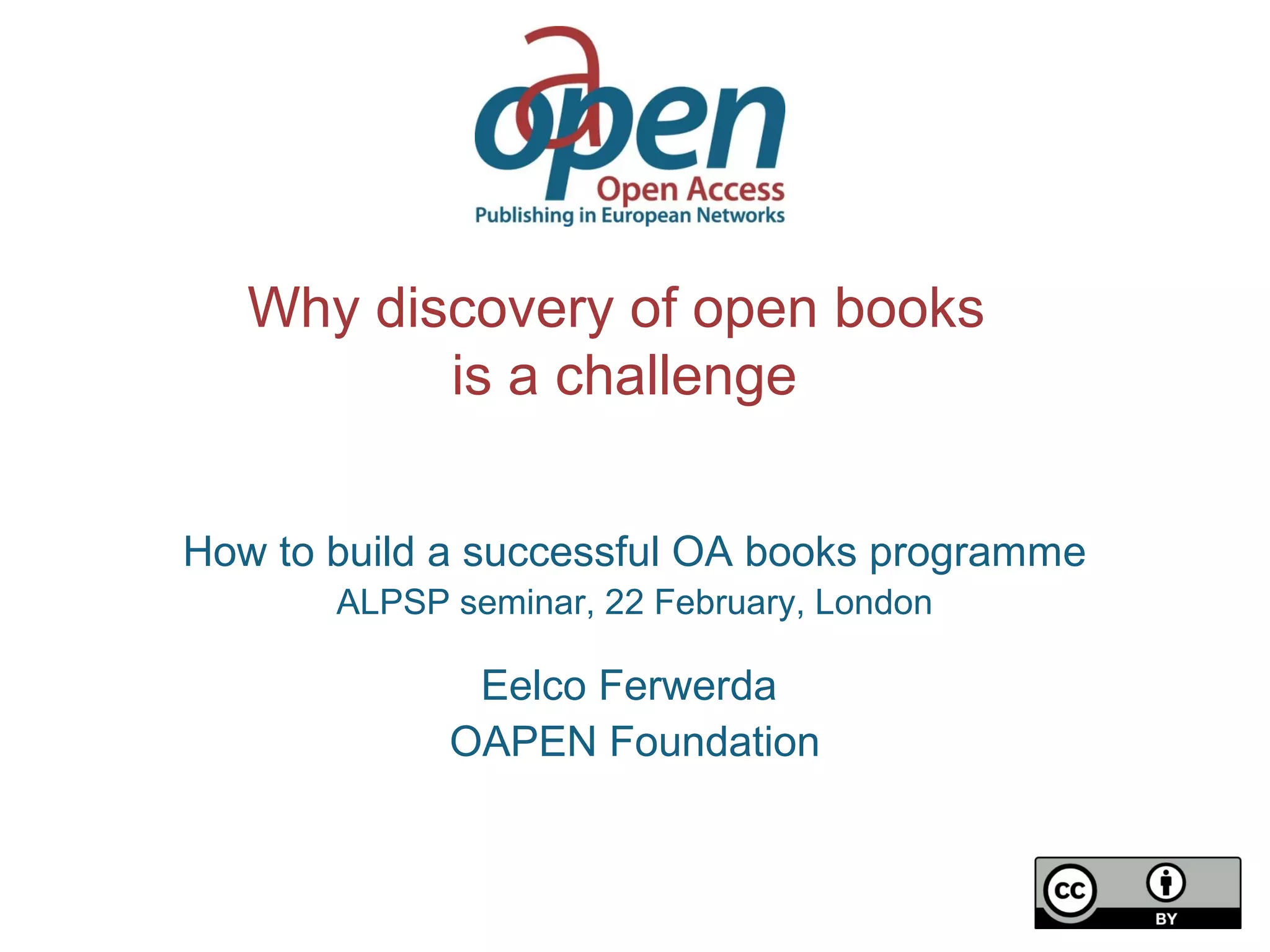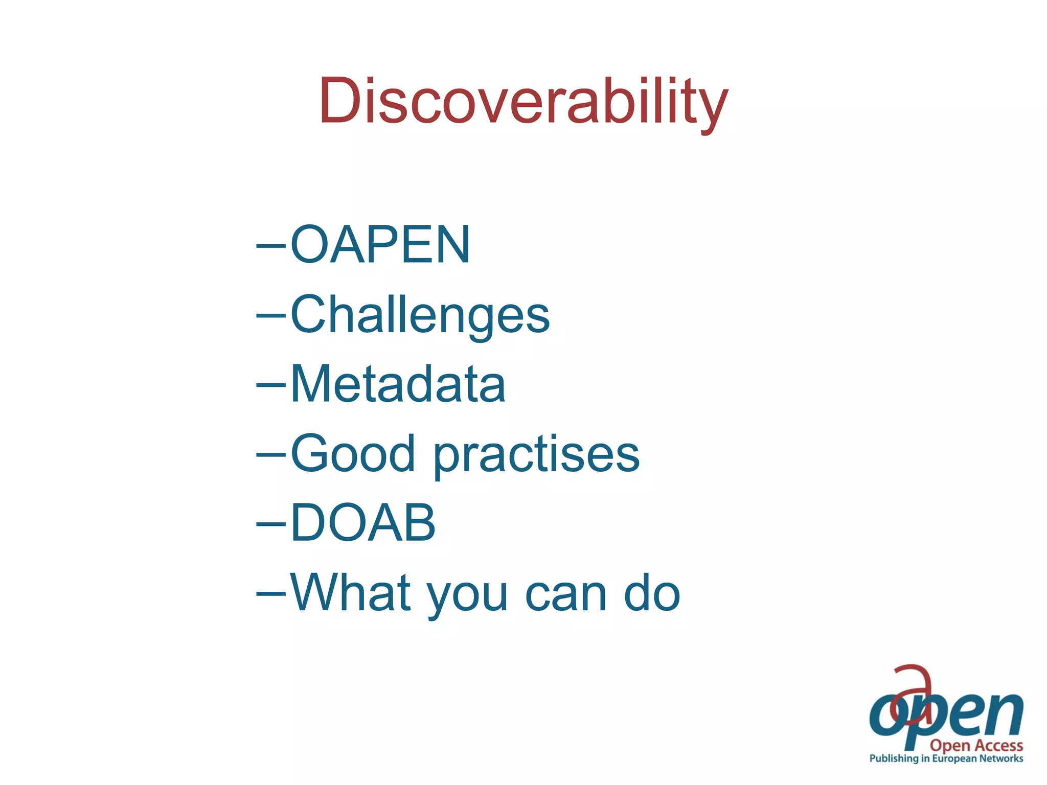 The discovery of open access books is challenging due to issues with metadata, pricing models, and rights information. Metadata standards like ONIX and CrossRef guidelines can help, along with supplying metadata to discovery services. The Directory of Open Access Books (DOAB) is a key discovery service that reviews publishers and lists their open access book metadata, helping increase downloads by 60%. For open access books to be discoverable in library catalogs, publishers should submit metadata to DOAB and libraries should systematically include DOAB records.
