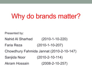 This document discusses why brands matter to both consumers and manufacturers. For consumers, brands help identify products they like or dislike, evaluate quality, reduce purchase time and risk. Brands may also provide psychological rewards. For manufacturers, brands identify their products, make repeat purchases easier, allow introduction of new products carrying existing brands, provide legal protection, allow premium pricing, help differentiate from competitors, and enable cooperation with other well-known brands. The document provides examples like Coke's global sales, Apple's success with the iPhone, Starbucks premium pricing, and Tata Motors' acquisition of Jaguar and Land Rover.