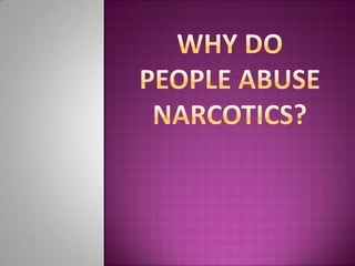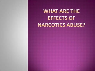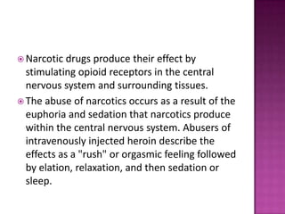 Narcotics produce euphoria and sedation in the central nervous system, which leads to their abuse. Abusers describe a "rush" feeling from injected heroin. Regular narcotic use during pregnancy can cause physical dependence and withdrawal symptoms in newborns. Narcotic abuse carries health risks like overdose and disease from unsafe drug use practices. Tolerance to narcotics develops with continued use, requiring larger doses to achieve the same effects.