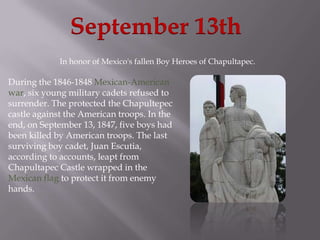 The document summarizes important dates celebrated in Mexico. It discusses that September 13th honors young military cadets who refused to surrender Chapultapec Castle during the Mexican-American War, with five boys being killed by American troops. September 16th is Mexican Independence Day, commemorating the beginning of the independence movement from Spanish rule in 1810. November 20th marks the anniversary of the Mexican Revolution beginning in 1910 to overthrow the dictator Porfirio Díaz.